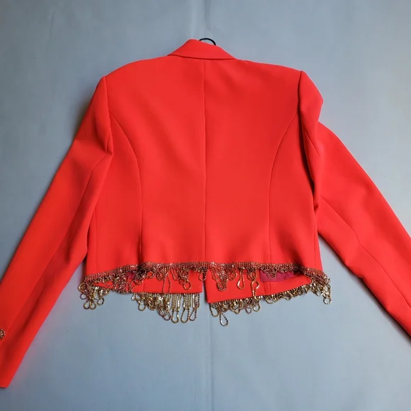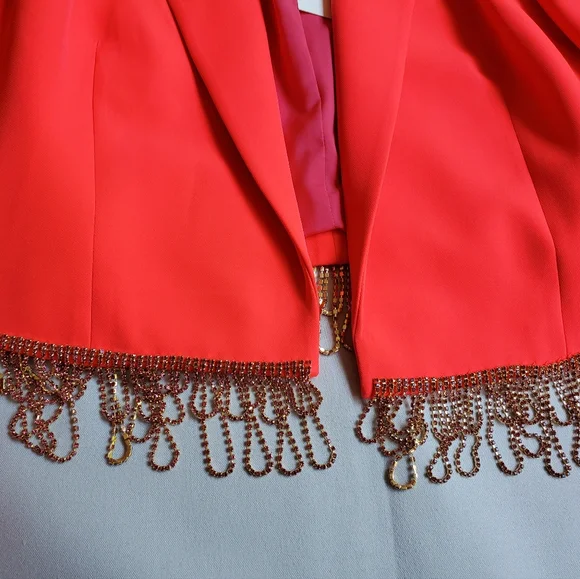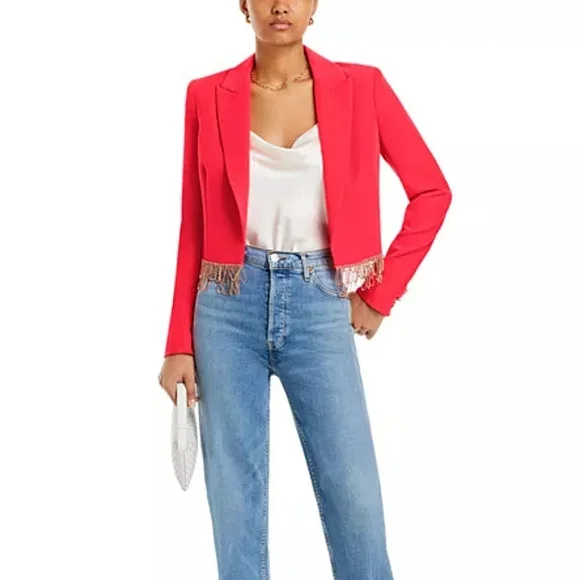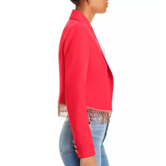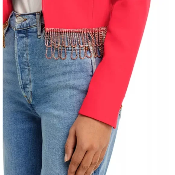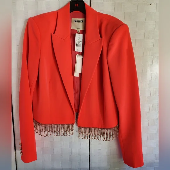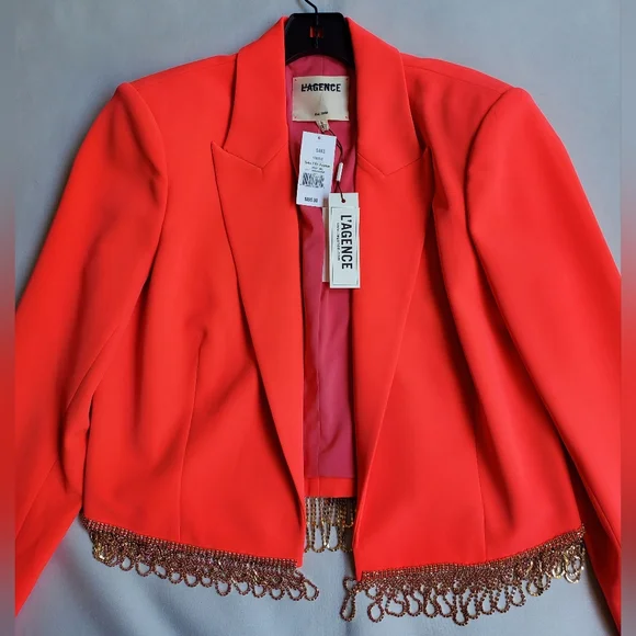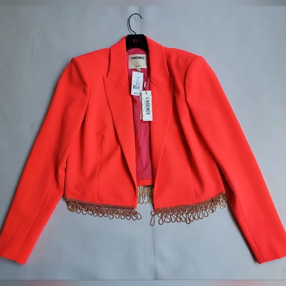 NWT$895 L'AGENCE Jen Crystal Fringe Cropped Blazer Jacket Sz 10Peak lapelsLong sleevesEmbellished-button cuffsOpen-front styleCrystal-trim at hem*one tiny dirt mark from store- will wash off before wearing*Brand New from Saks Fifth Avenue!! Inner Strikeout to prevent returns back to Saks. 100% AUTHENTIC with Original tags!! Tags: FALL, Autumn, HALLOWEEN, Winter, Christmas, holidays. Spring, summer. MOTHERS DAY! BIRTHDAY GIFT 🎁 anniversary gift, valentine's gift, 🎅 Christmas gift 🎄 Bridal shower, wedding season, NEW YEAR 🍾, LUXURY Check out my closet for more designer and luxury brands like Ferragamo, Gucci, Versace, Valentino, Jimmy Choo, Stuart Weitzman, Zanotti, Webster, Yves Saint Laurent YSL, Noten, Louboutin, Burberry, Canada Goose, Mackage, Ugg, Lacoste, Moncler, Proenza, Chloe, Prada, Yurman, Dior, Tiffany, Tory Burch, Kate Spade, Balenciaga, Off-White, Stella McCartney, Wang, Barbour, Bottega, Blahnik, Montblanc, MCM, MOTHER, Cavalli, Rick Owens, Puma, Sorel, SJP, Zimmermann, Isabel Marant etc